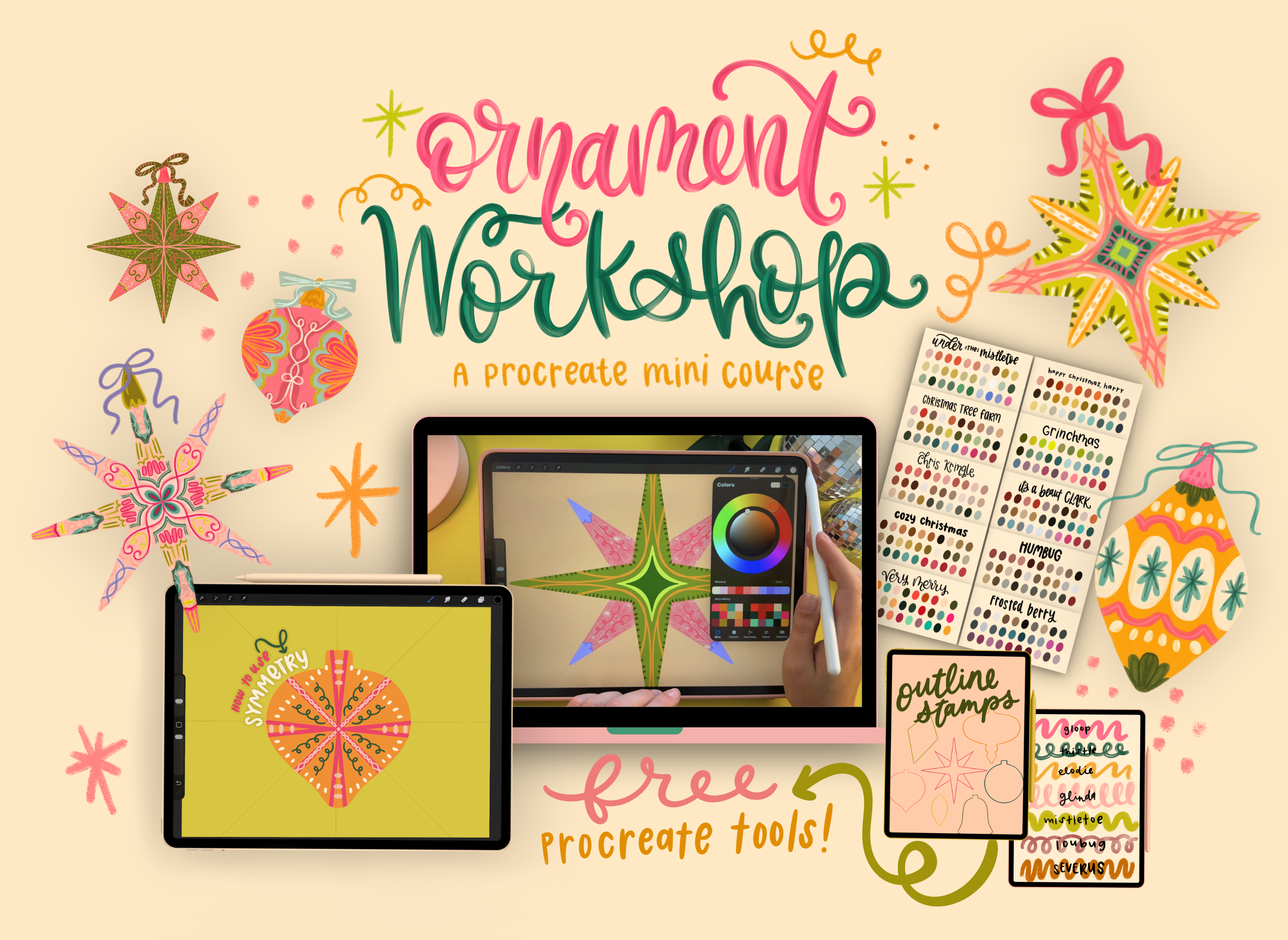 Confidently craft ornaments in Procreate! In this 4 video lesson mini course you will learn how to utilize the symmetry tool, master layering, building unique ornaments from start to finish, and how to export these designs! Also included are 10 hand crafted Christmas inspired colored palettes, 7 procreate brushes, and various ornament shaped stamps to build your ornaments.